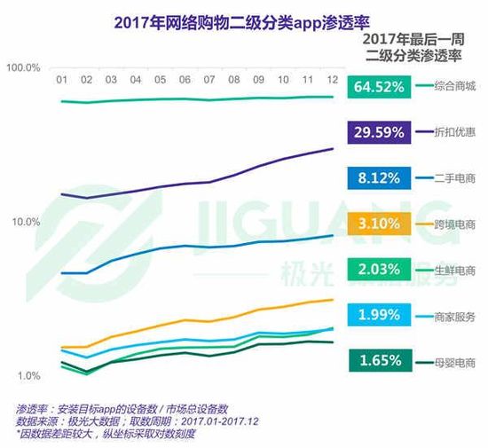 近日,极光大数据发布了《2017年度网络购物app市场研究报告》,从综合电商、母婴电商、生鲜电商、跨境电商、二手电商、折扣优惠、商家服务等七大类目,分析了网络购物行业的发展现状。