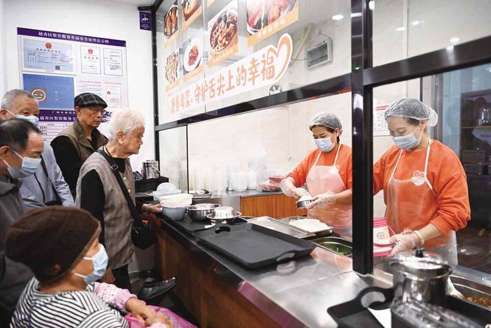 在广州市越秀区洪桥街道三眼井社区长者饭堂,工作人员在给前来用餐的老年人打饭(2024年1月17日摄)。新华社记者 邓华 摄