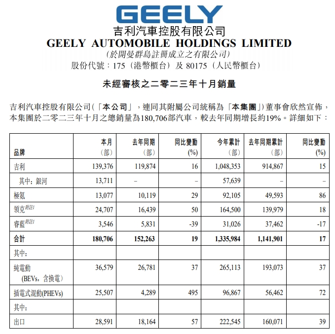中国经济网11月3日讯(记者 姜智文)近日,吉利汽车控股有限公司发布数据显示,吉利集团10月销量再创新高达180706辆,同比增长约19%;其中,新能源汽车销售62086辆,连续三个月创新高,占比突破34%。在此助推下,吉利集团前10个月累计销售1048353辆,同比增长15%。