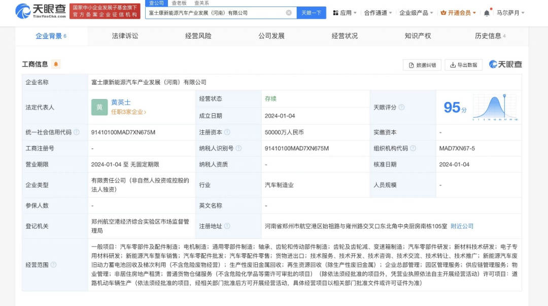 2024年1月9日,天眼查显示,近日,富士康新能源汽车产业发展(河南)有限公司成立,注册资本5亿元人民币,经营范围含汽车零部件及配件制造、电机制造、新材料技术研发、新能源汽车整车销售、企业总部管理、园区管理服务、供应链管理服务、道路机动车辆生产等。股东信息显示,该公司由富士康新事业发展集团有限公司全资持股,后者为鸿富锦精密电子(郑州)有限公司全资子公司。