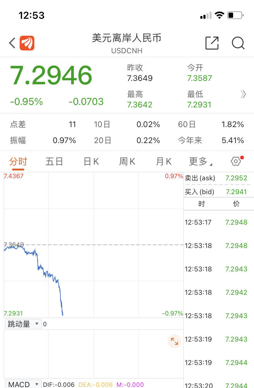 北京时间9月11日中午,离岸人民币兑美元连续收复7.33、7.32、7.31、7.30关口,日内涨幅超700点;在岸人民币兑美元涨近1%,日内涨超700点。
