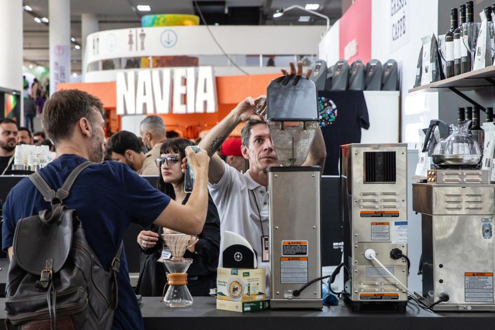 2023年6月23日,工作人员(中)在巴西圣保罗举行的咖啡节上制作咖啡。新华社记者王天聪摄