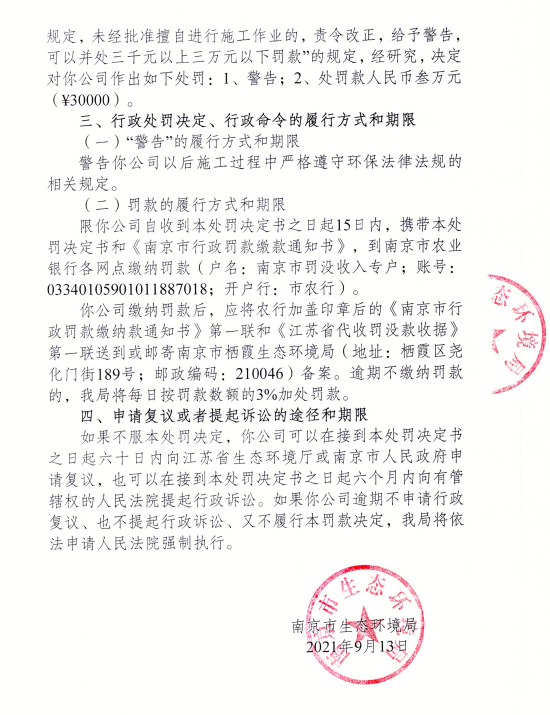 南京市生态环境局处罚决定日期为2021年9月13日。