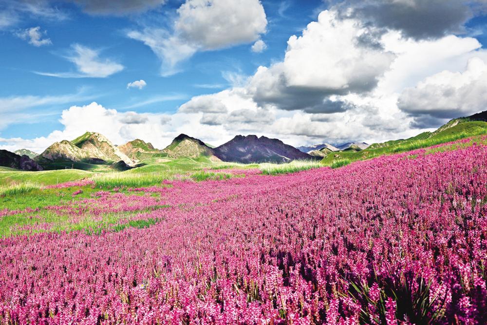 海寺风景区,高山下的花海草原各种鲜花盛开,蔚为壮观。这是一处人间仙境,绿茵盖地,碧草连天,野花竞放,铺锦列绣;各种花卉争奇斗艳,红似火、黄如金、白似雪、紫若霞,芳香醉人。尤以狼毒花,野生薰衣草为多,在蓝天白云衬托下分外美丽。附近山峦上苍松翠柏遮天,奇花异草蔽地,山、树、花、草相映成趣。