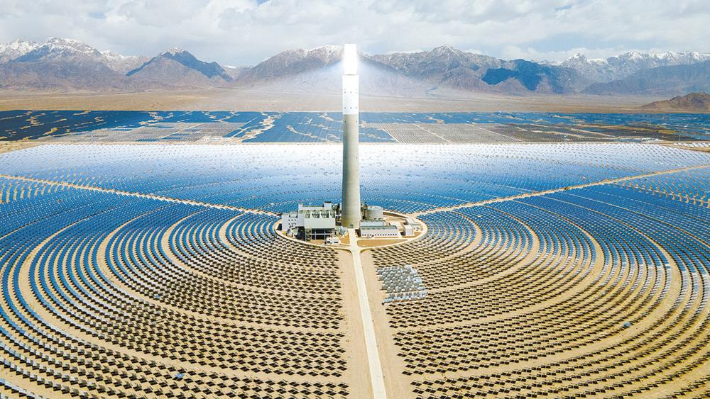 在绿色发展馆,各色沙盘应接不暇,风力发电的白色立柱、光伏发电的蓝色海洋、高山流水的抽水蓄能站……一路走来,定能将人带进青海光富、水丰、风好的壮丽景色,也走进清洁能源发展日益完善的产业链。在省会西宁,以光伏制造为主的清洁能源制造产业高速发展,打造了“多晶硅—单晶硅—切片—太阳能电池—电池组件”完整的光伏制造产业链;在海南藏族自治州绿色产业发展园区,塔拉滩上深蓝色的光伏板熠熠生辉,风力发电机的叶片迎风飞转,百米高的熔盐塔式光热塔和“镜子海洋”显得科技感十足……