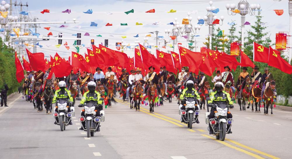 开幕式前,天峻县组织开展“千匹骏马行天峻”活动,来自全县各乡镇的千名牧民骑手手持党旗、国旗、五色彩旗穿城而过,党旗国旗飘扬,千匹骏马奔腾,展现了天峻各族干部群众共同团结进步、共同繁荣发展、共建美好家园的生动画面。