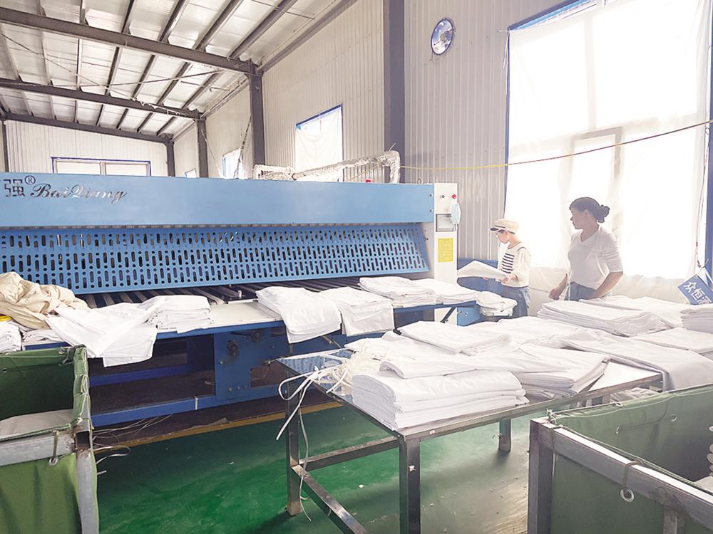 在柴旦村产业园布草清洗厂,宽敞明亮的洗涤车间里,工人们有条不紊地清点、洗涤、熨烫、整备……一条条雪白的床单经高温消毒后熨烫平整。这里每个月能提供2.7万张床位的整套被单。