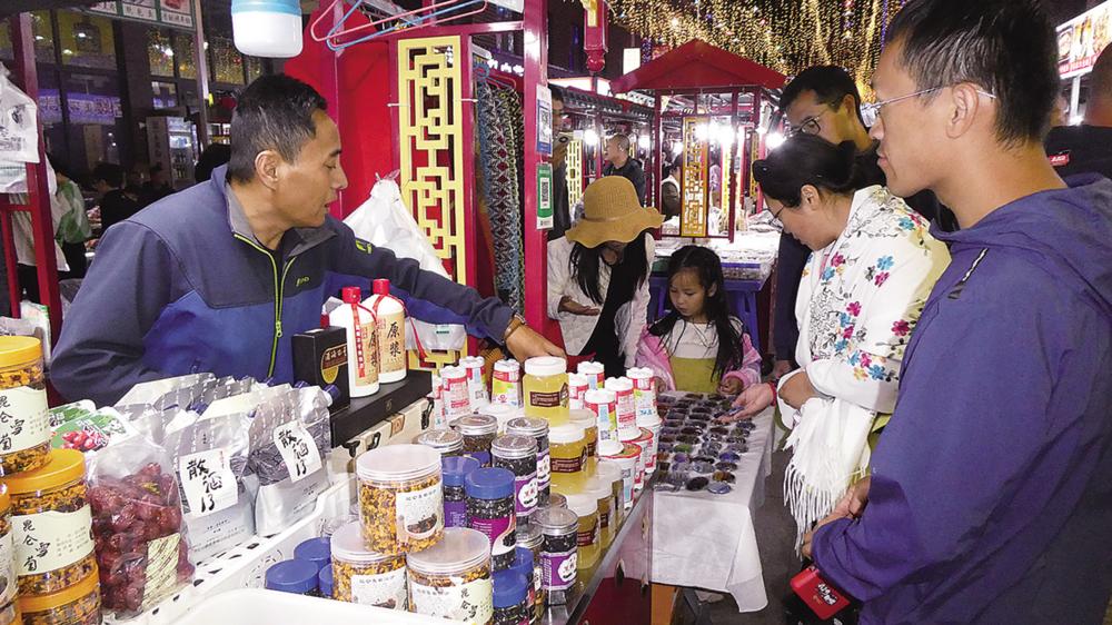 柴旦镇翡翠旅游步行街上,商户在售卖当地特产。