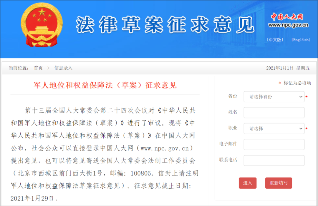 详情>>军人地位和权益保障法(草案)征求意见入口