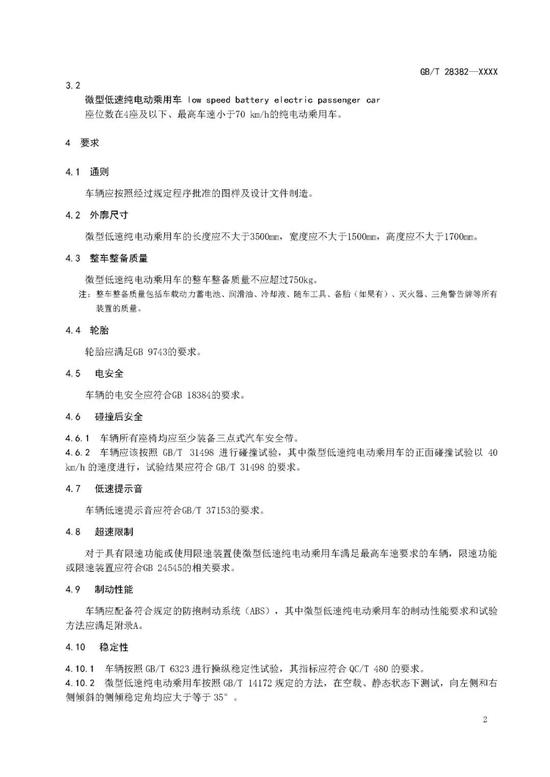 中国经济网北京6月18日讯 昨日,工信部对新版国标《纯电动乘用车技术条件(征求意见稿)》公开征求意见,截止日期为2021年8月16日。本次《征求意见稿》中增加了微型低速纯电动乘用车的定义和标准,将其作为纯电动乘用车的一个子类进行管理,并规定该类车型座位数应不超过4座、长宽高不超过3500/1500/1700mm、整备质量不超过750kg;在动力方面要求最高车速小于70km/h、续航里程不小于100km、0km/h-30km/h加速时间不大于10s、通过4%坡度爬坡车速不小于20 km/h、通过12%坡度的爬坡车速不小于10 km/h;在电池能量密度方面则要求不低于70Wh/kg。
