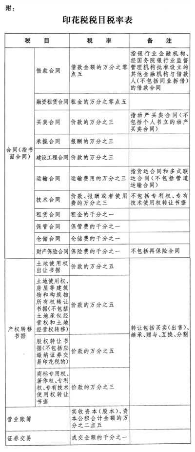 第四条 印花税的税目、税率,依照本法所附《印花税税目税率表》执行。